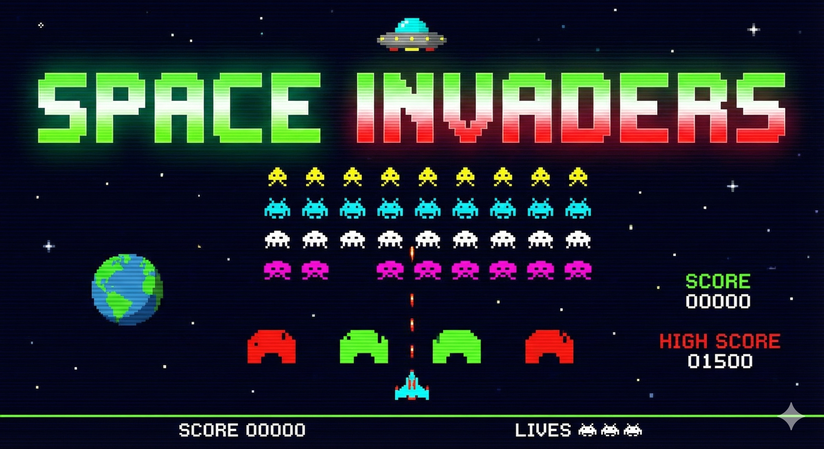 You pilot a laser cannon at the bottom of the screen, firing at rows of aliens that march back and forth and slowly drop toward Earth. The challenge increases as the enemies speed up with every kill, forcing you to balance offense with dodging return fire behind destructible barriers.